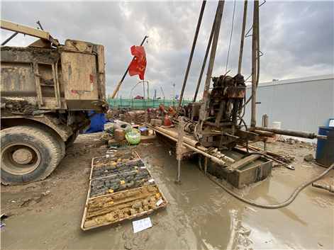 3月6日,臨時(shí)棧橋正式通車,勘察團(tuán)隊(duì)與眾多施工隊(duì)伍一同入場(chǎng),并在當(dāng)天晚上就提供了現(xiàn)場(chǎng)施工緊急需要的地質(zhì)柱狀圖及剖面圖。由于現(xiàn)場(chǎng)參建單位眾多,作業(yè)面有限,工人們只能開展交叉作業(yè),在泥土松軟的場(chǎng)地上不斷搬動(dòng)鉆機(jī),調(diào)整作業(yè)地點(diǎn)。
